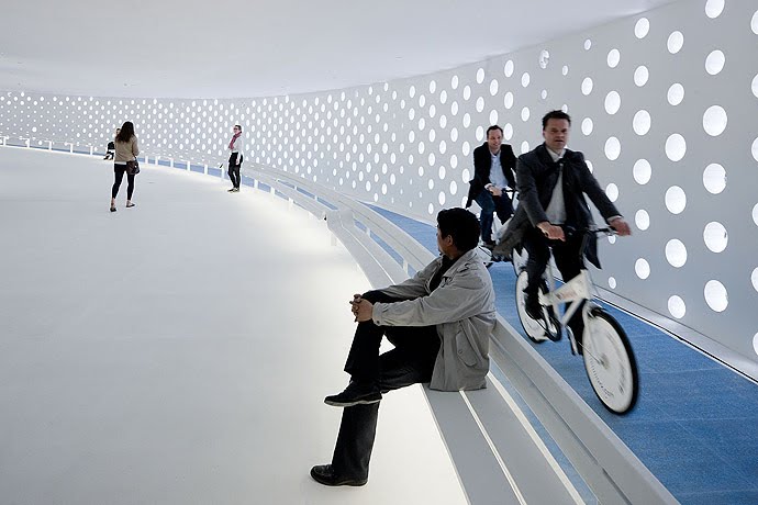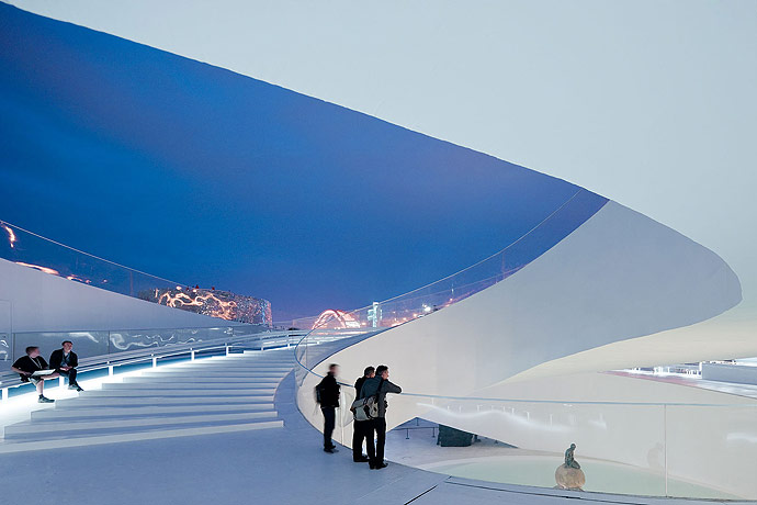 The Danish Pavilion at the World Expo in Shanghai is a class act. Bypassing propagandistic advertising, the Danes have combined art and architecture with an icon (Copenhagen's Little Mermaid) creating a spiral shape for visitors to explore while taking in photographs, films and Jeppe Hein's social bench and fountain. As well as animating the architectural space Hein's intervention functions as a barrier between the pedestrians and cyclists who use the cycling lanes that take them from the ground through two curves and up to a level of 12 metres and down again.