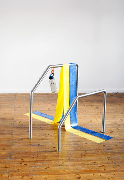 Image: Alicia Frankovich, Not Yet Titled, 2014, stainless steel, Thera bands, drink bottle, shoe lace, 80 x 90 x 45 cm. Exhibition view, Kunstverein Hildeheim
