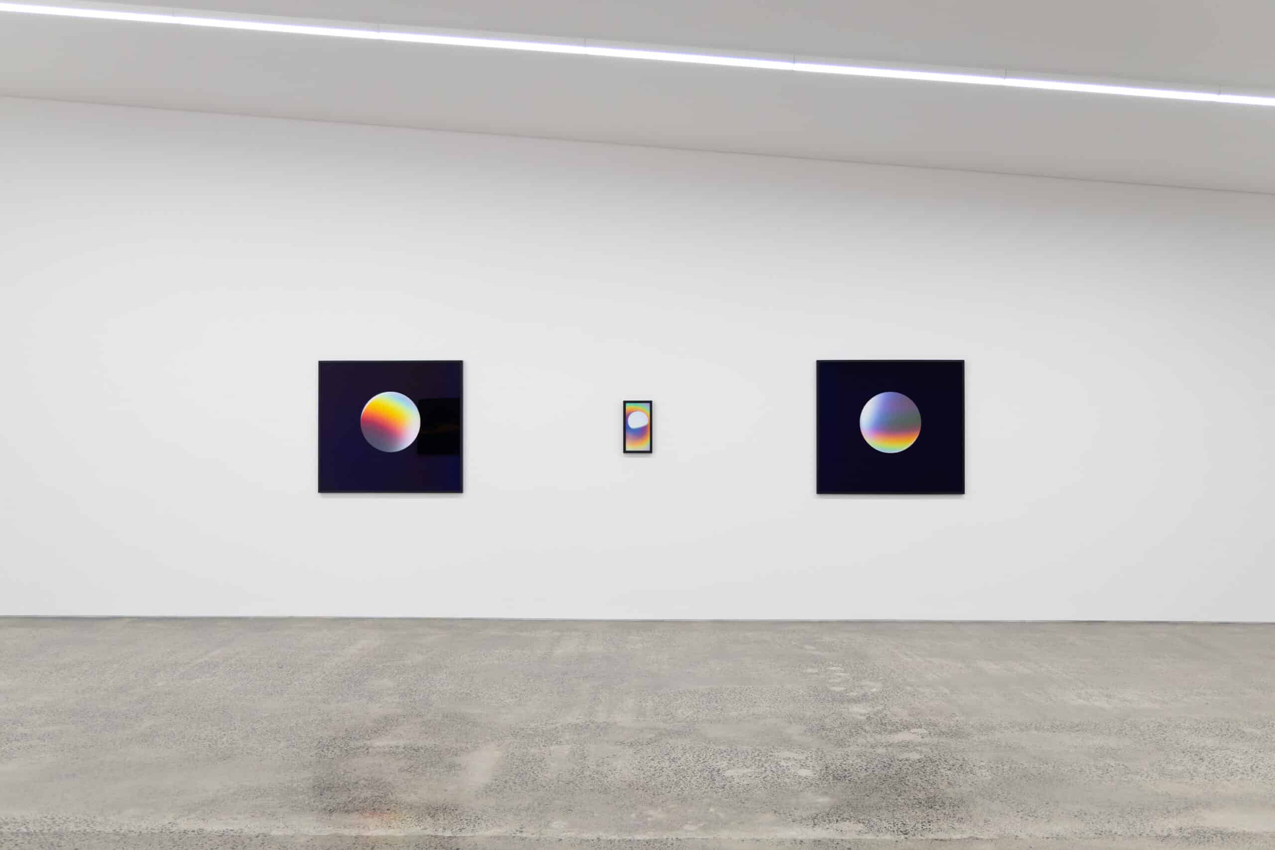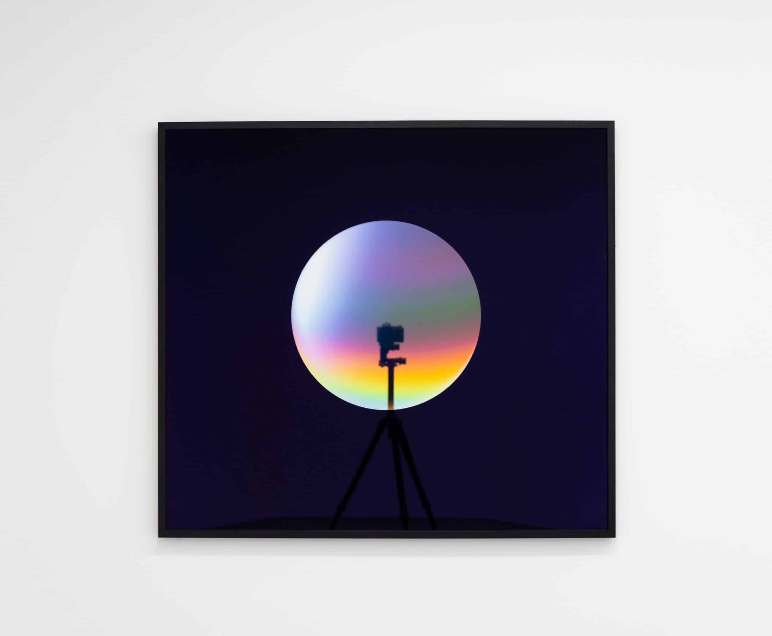 These manoeuvres attract and confound. Iridescent surfaces shift in relation to the viewer’s position, particularly in the Gateway works: a series of untethered, radiant orbs that oscillate between an image and an entrance. By layering titanium-coated glass over luminous spheres, a scattering of light known as structural colouration is achieved – a rare phenomenon usually observed in organic materials, from opalescent butterfly wings to the shells of pearl oysters. The result is one in which light’s modulation alone—as opposed to pigment—gives rise to shifting, jewel-toned colour values. The perceiver is met with deep, illusionistic space or obdurate surface image from one moment to the next. Through formal innovations, the artist devises eerily familiar worlds that subvert the usual rules of engagement.