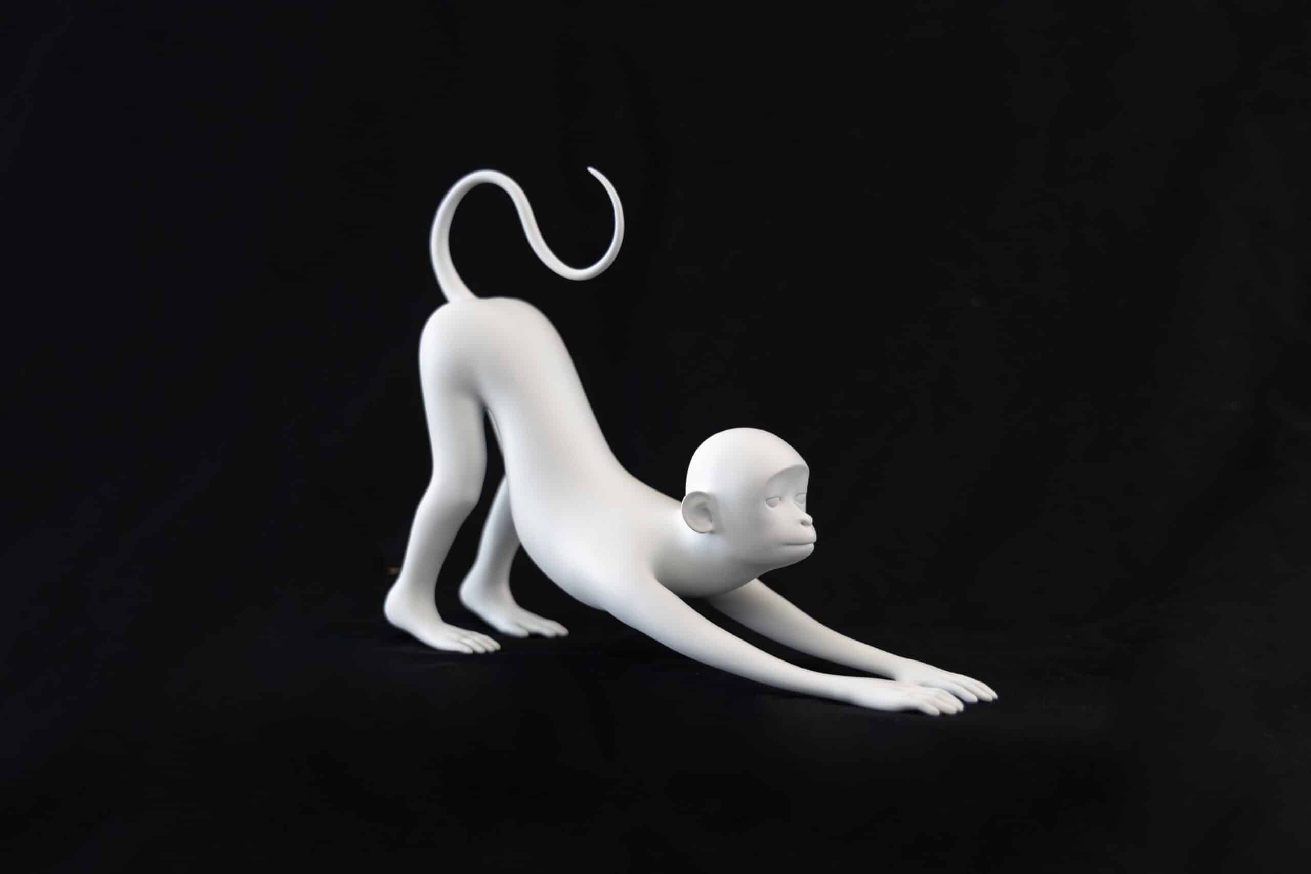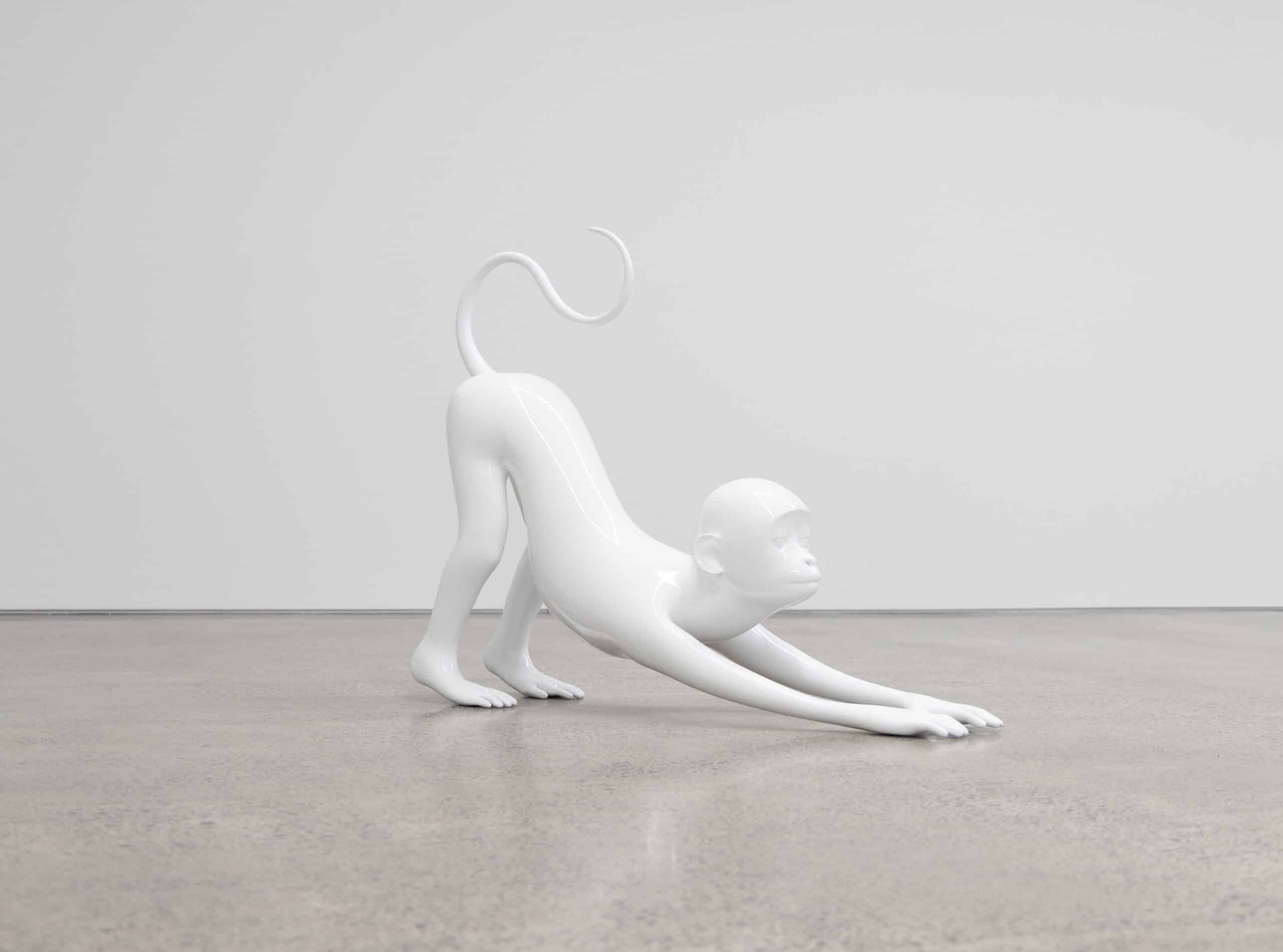 In contrast, the sculptural work Pre stages a body still in the realm of potentiality. On one level it is simply a delightful piece of Jeff Koons-esque (through an East Asian lens) pop art, a stylised monkey posed like the “downward dog” yoga position. “Pre” implies the conceptual experience prior to an event. The monkey is neither one thing nor the other, unresolved, an Ur-state tabula rasa. There is a temptation to project our own desires, fantasies and interpretations upon it.