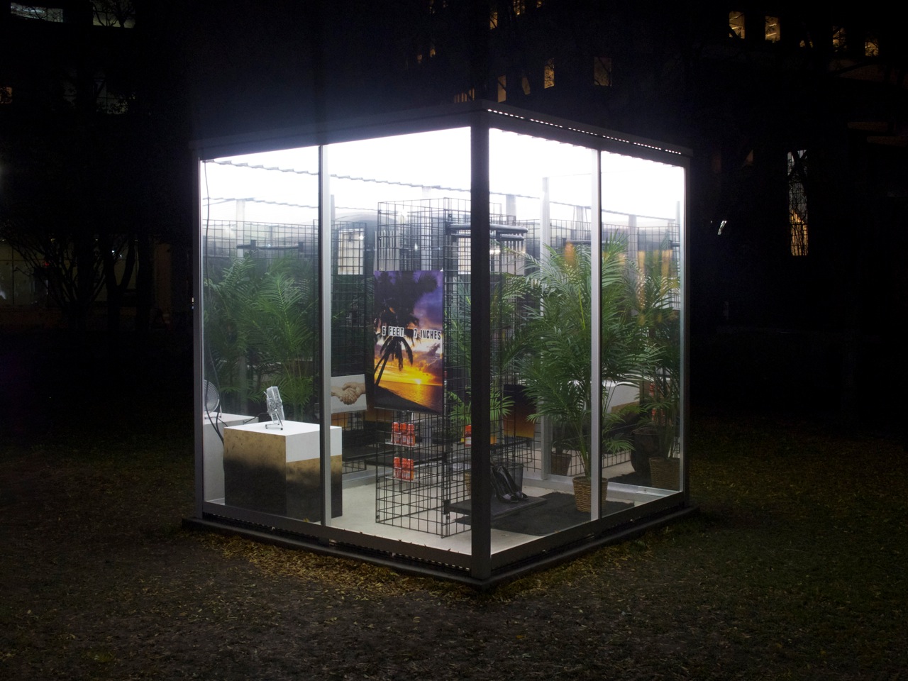 Martin Basher's three large-scale mirrored vitrines appear reflective and slightly translucent by day, revealing their contents only at night. Lit from within and stocked with both high- and low-end consumer products, fabricated structures, and hand-made paintings, the cubes begin to mimic retail spaces where strange paintings hypothesize a future satisfied by consumer desires. Blending together ideas of retail display, advertising and Modernism, Basher's work questions the environmental and social implications of consumption in our times. From the Public Art Fund website