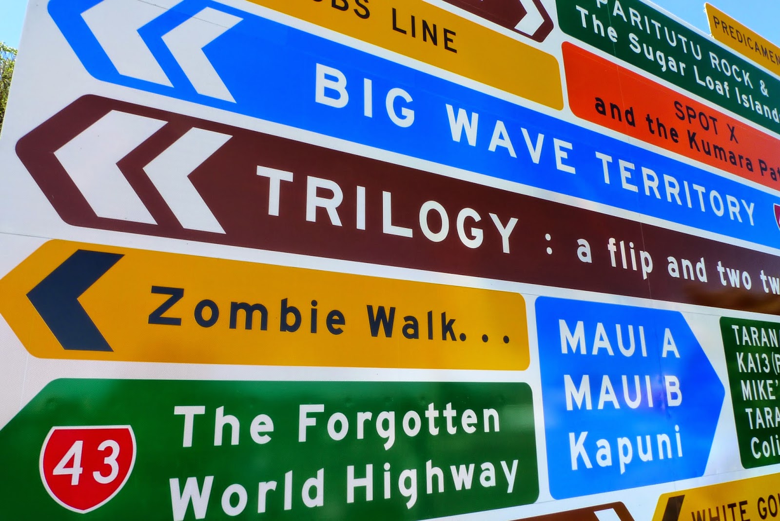 Len Lye's Wind Wand is a striking and much-loved feature of New Plymouth's coastal walkway, which also includes John Reynolds' Big Wave Territory. This work celebrates Taranaki's rich cultural landscape, directing passers by to various local and regional destinations – the Mountain, Paritutu Rock and Sugar Loaf Island, SPOT X and The Forgotten World Highway. Using Transit New Zealand's road design format and materials, the high reflection sign also provides cultural points of departure, including artistic legacies, such as the writing of celebrated author Ronald Hugh Morrieson and Len Lye's kinetic sculpture.