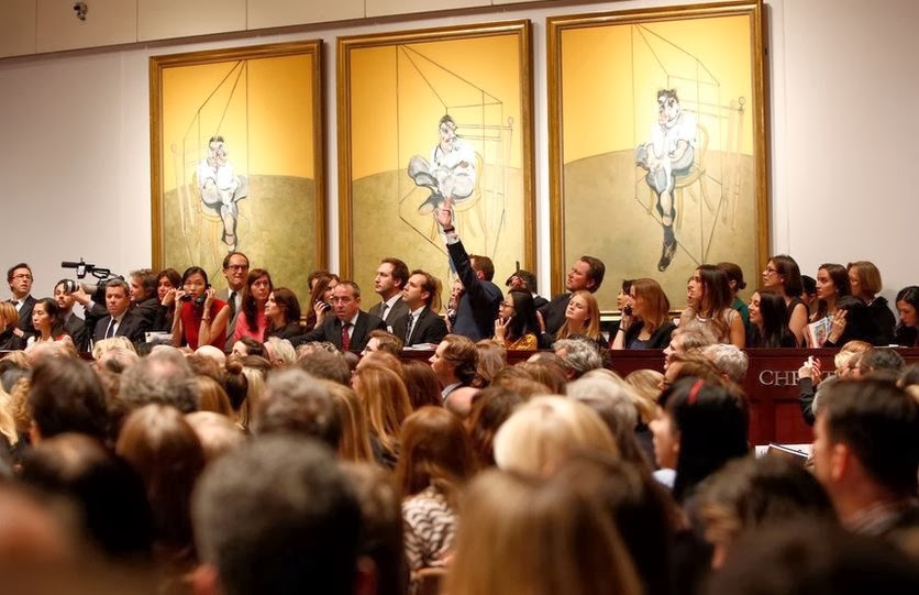 Christie's New York has staged the highest grossing auction ever with a postwar and contemporary art sale that brought in $691.6 million and set a new record for a publicly traded artwork with Three Studies of Lucian Freud by Francis Bacon, which sold for $142 million – 20 million more than Edvard Munch's The Scream. And Jeff Koons' sculpture Balloon Dog (Orange) fetched 58.4 million, an auction record for a living artist.