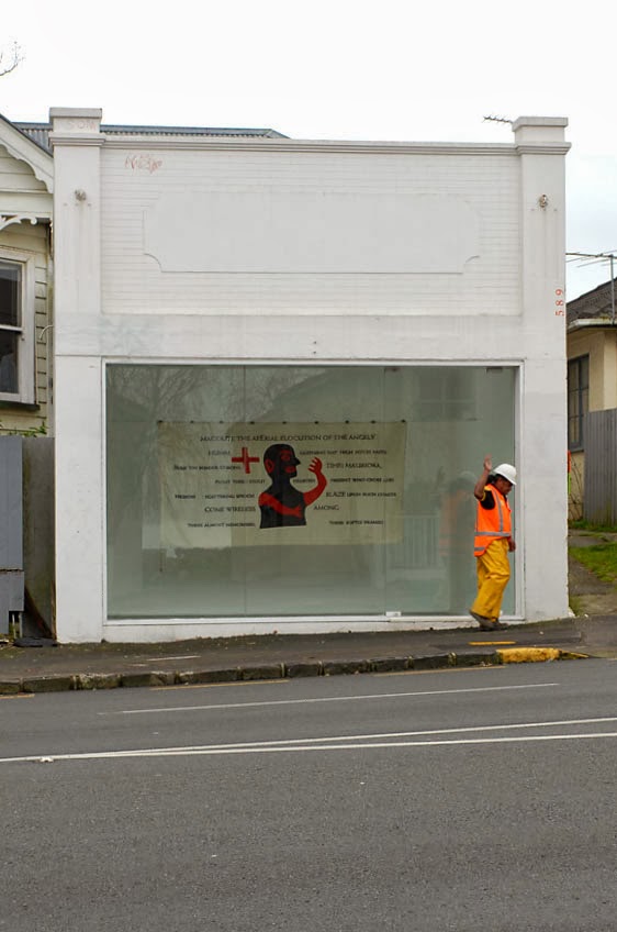 Image: Leigh Davis' Macoute, Temptation of the World from a sequence of thirty exhibitions entitled Time, Text & Echoes, each devoted to a single Leigh Davis flag poem. Jar is located at 589 New North Road, Kingsland, Auckland