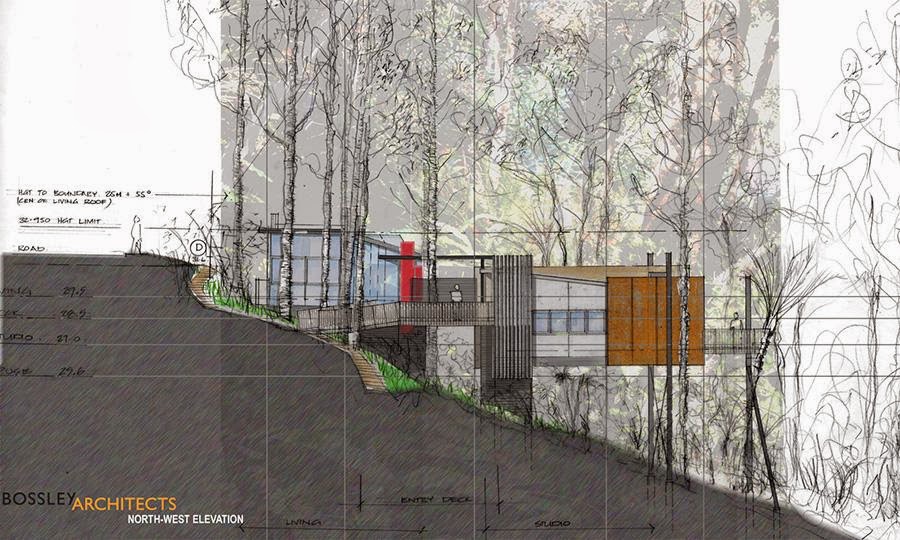 In a piece in the eMagazine World Architects, this drawing of the McCahon House, designed by Bossley Architects for use as an artists residency programme, was part of a compilation of material to illustrate the value of hand-drawn sketches in the age of computers. A hardline elevation and a looser depiction of landscape over a photograph of trees and the sloping site, accentuate the design for a low-impact residence set among the trees and alongside the historic cottage that Colin McCahon lived and worked in from 1953 – 1960.
