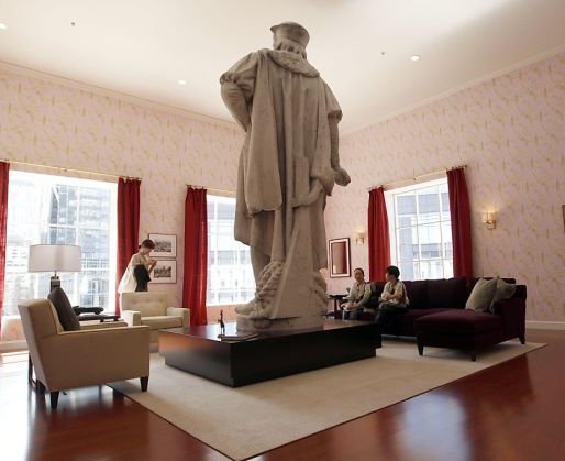 Tatsu Nishi's new Public Art Fund-commissioned work puts viewers in a room with Christopher Columbus. Nishi has placed a spacious, furnished living room 60 feet above NY's Columbus Circle, atop a pedestal of metal scaffolding. Visitors climb six flights of stairs to to reach the room, which measures 30 x 17 feet with a 16-foot ceiling height. In the centre of the room is the 13-foot-tall marble statue of Christopher Columbus, made by Gaetano Russo, that has stood over the plaza for 120 years.