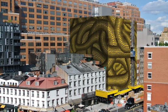 Yayoi Kusama is set to create a 120-foot version of her Yellow Trees in New York's meatpacking district. The artwork, which doubles as netting for a condo construction site, will be visible from New York's High Line, making it the latest in a number of artworks that galleries, developers and artists have staged in sight of the elevated park, hoping to cash in on the crowds that use it every day.