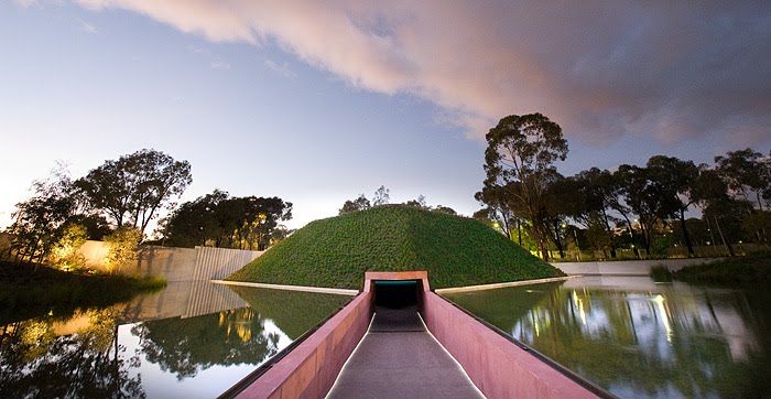 Images: James Turrell, Within without (2010), lighting installation, concrete and basalt stupa, water, earth, landscaping. National Gallery of Australia, Canberra