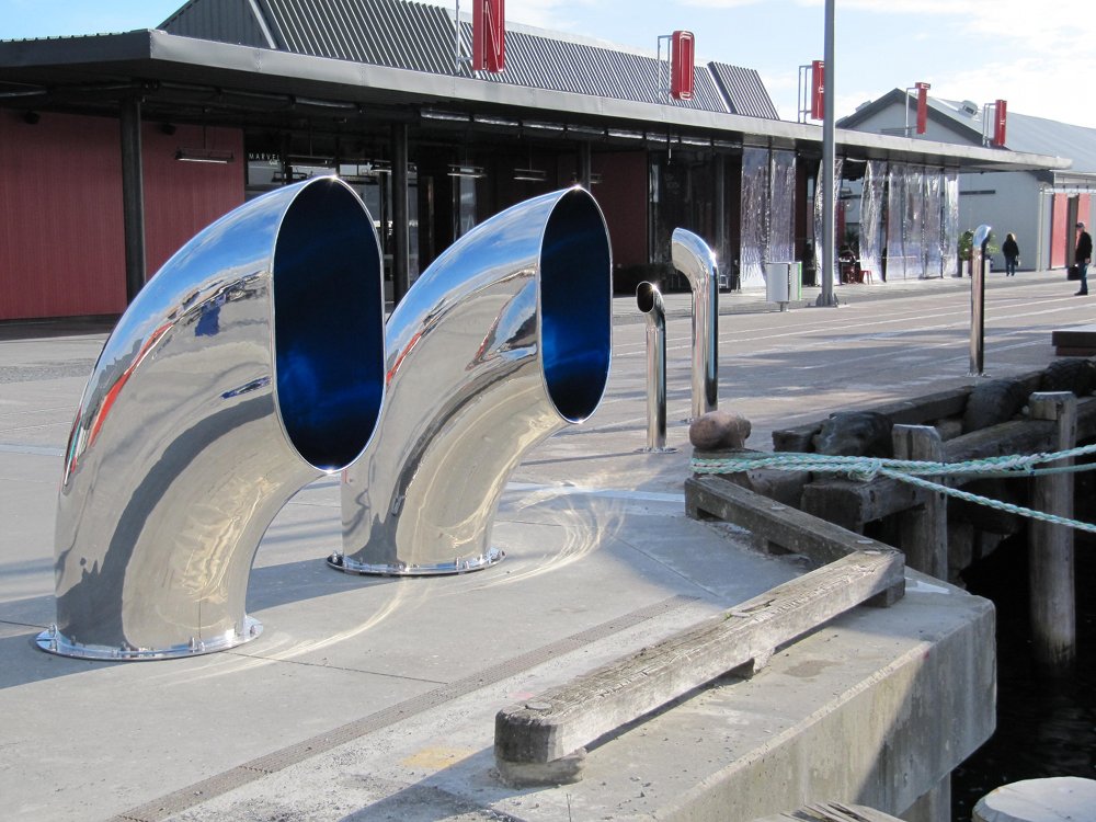 Sounds of Sea is based on the ventilation funnels and speaking tubes used on ships with the components designed for sitting, listening and speaking. The commissioners say “the sculptures act as a reminder of the history of the warterfront and its on-going role as an active shipping harbour, transforming the wharf into and old shipping deck.”