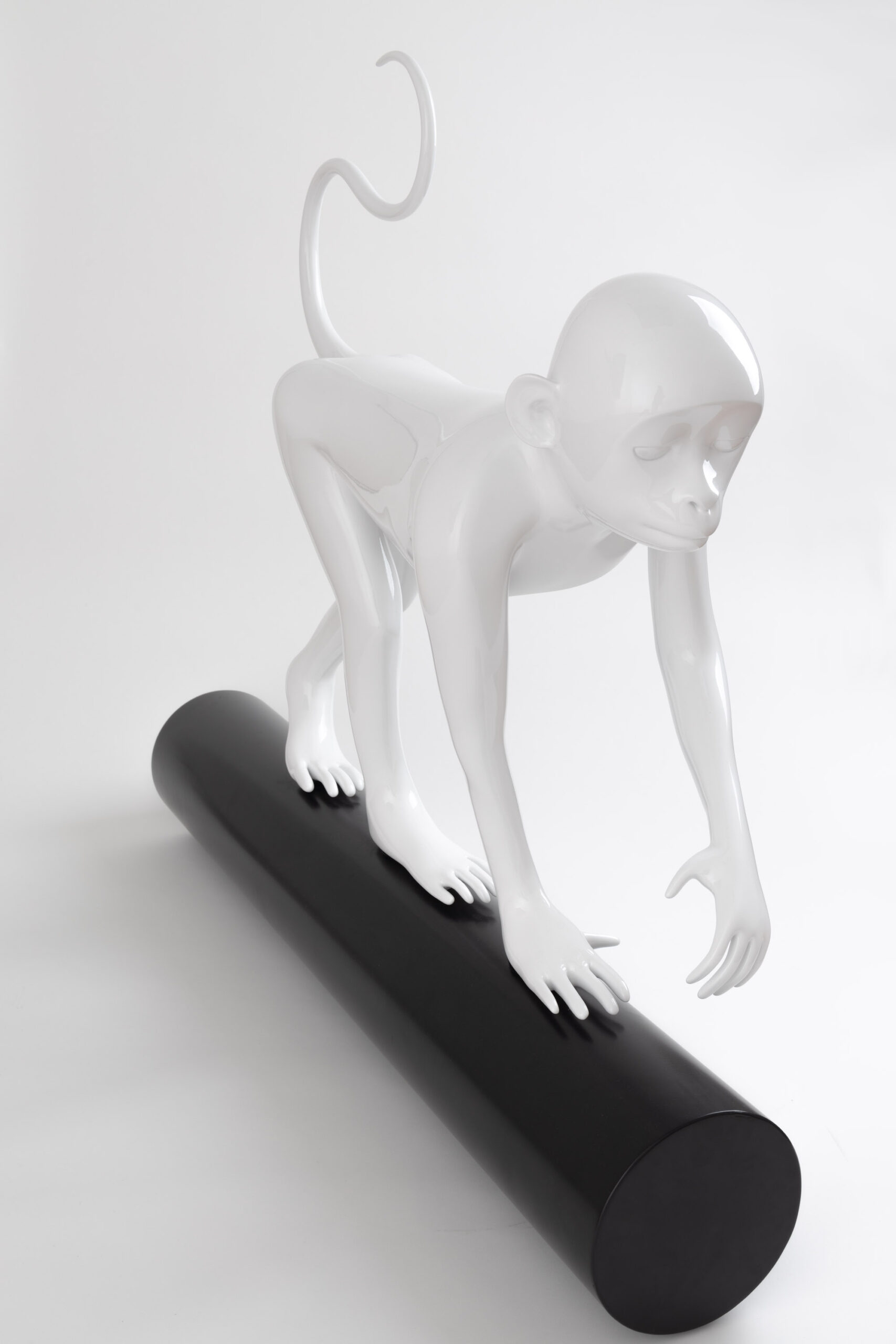 The latest solo exhibition by Seung Yul Oh teases concepts of hard and soft and introduces two new works. Bowl takes the form of a monkey, the latest in a series of anthropomorphic sculptures that explore the dynamics of scale and oscillate between adorable and curious. Although enlarged to roughly one metre in length, Oh’s sculpture is accurately proportioned and realistic, seeming to come to life as it nimbly walks along a rod on all fours. We would expect the body of a monkey to have the warmth and softness of a living being, but this one is solid with a core of hard resin.